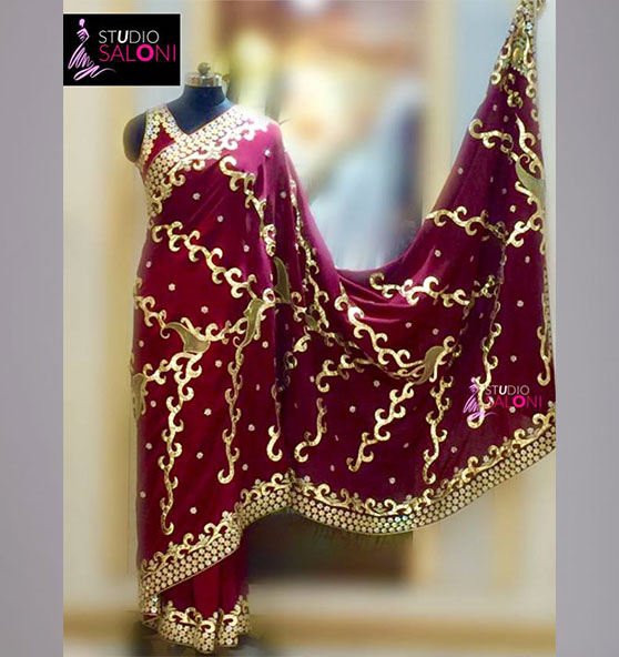 A combination of traditional and contemporary trends, this wine saree will surely give a new meaning to the word fashion.The golden faux leather work teamed up with the traditional gotta patti embroidery and beautiful handmade tassles are state of the art.Pure crepe de chine saree and blouse add to the sensual feel of the attire.